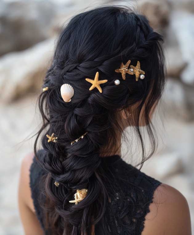 Cute yet elegant sea party with seashells, starfish and pearl accessories on elegant braided hairdo.