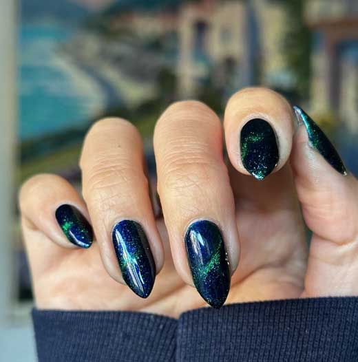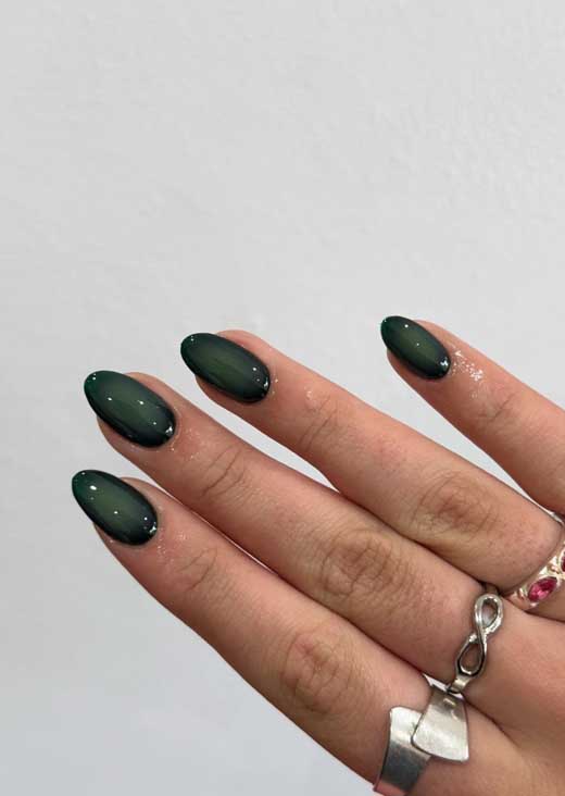 The aura effect in the design below creates a whimsical, dark, and chic witchy mood that adds a touch of sophistication to the emerald green nails.