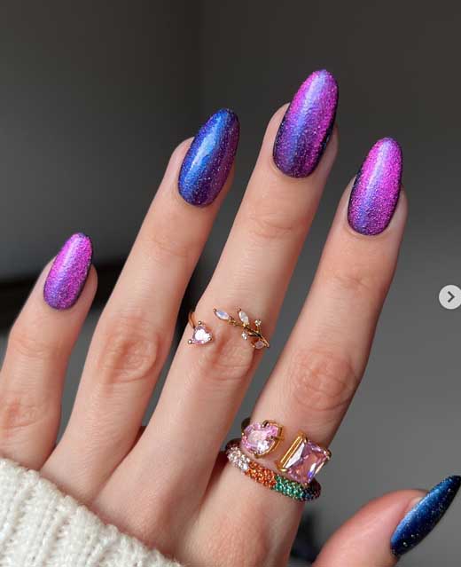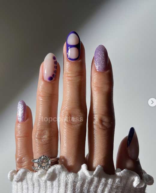 Purple is probably the number one witchy color—if there were a ranking for a witch’s palette. There are so many elegant ways to make a purple manicure evoke magical mysticism, and the glittery designs below are proof of that.