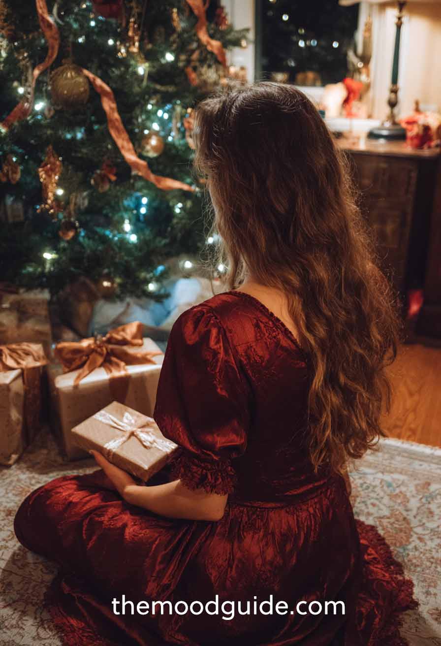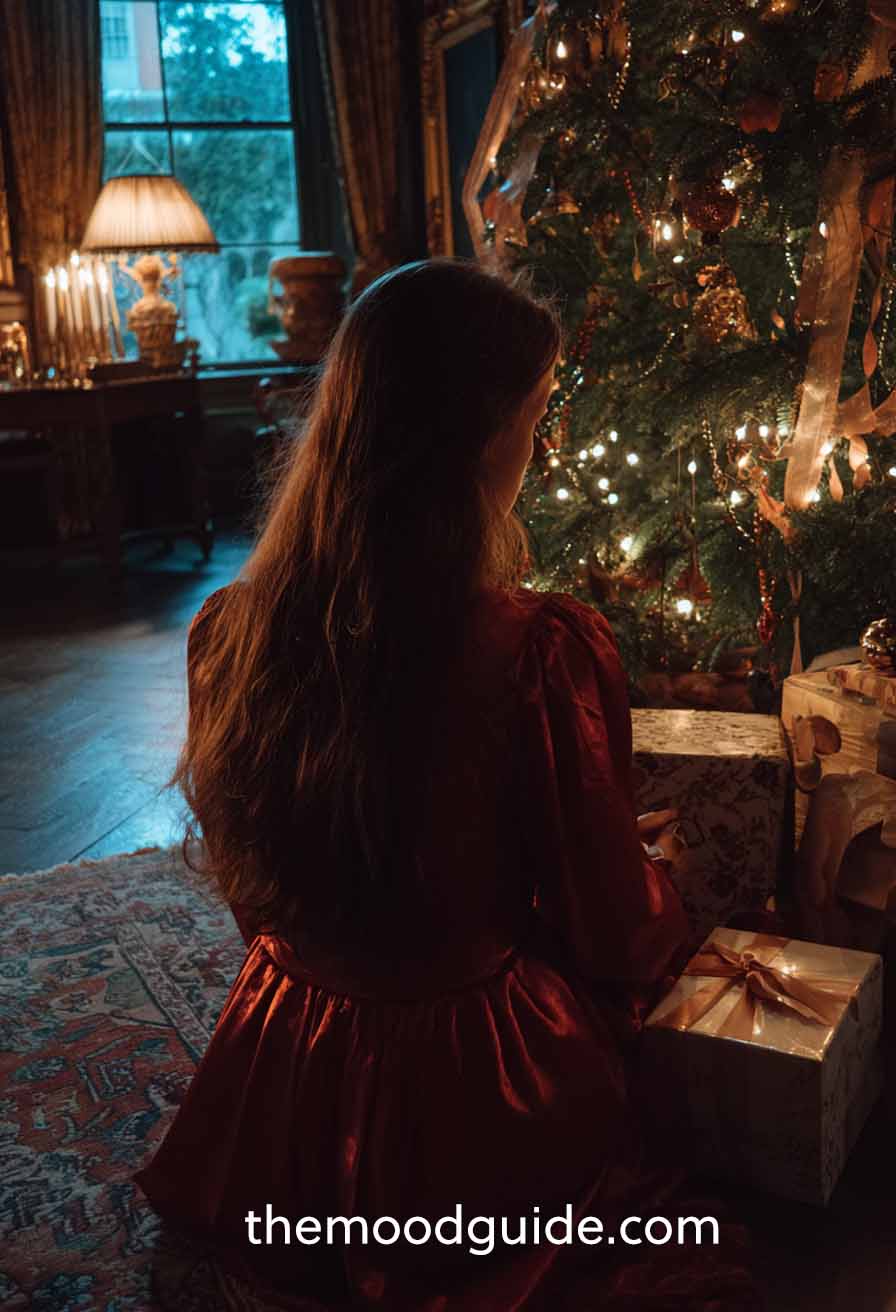 The entire look feels like stepping into the world of Little Women, or a cozy 19th-century Christmas scene. It pairs with the old fashioned magic of candlelight, handmade gifts, and tender moments shared by the tree.