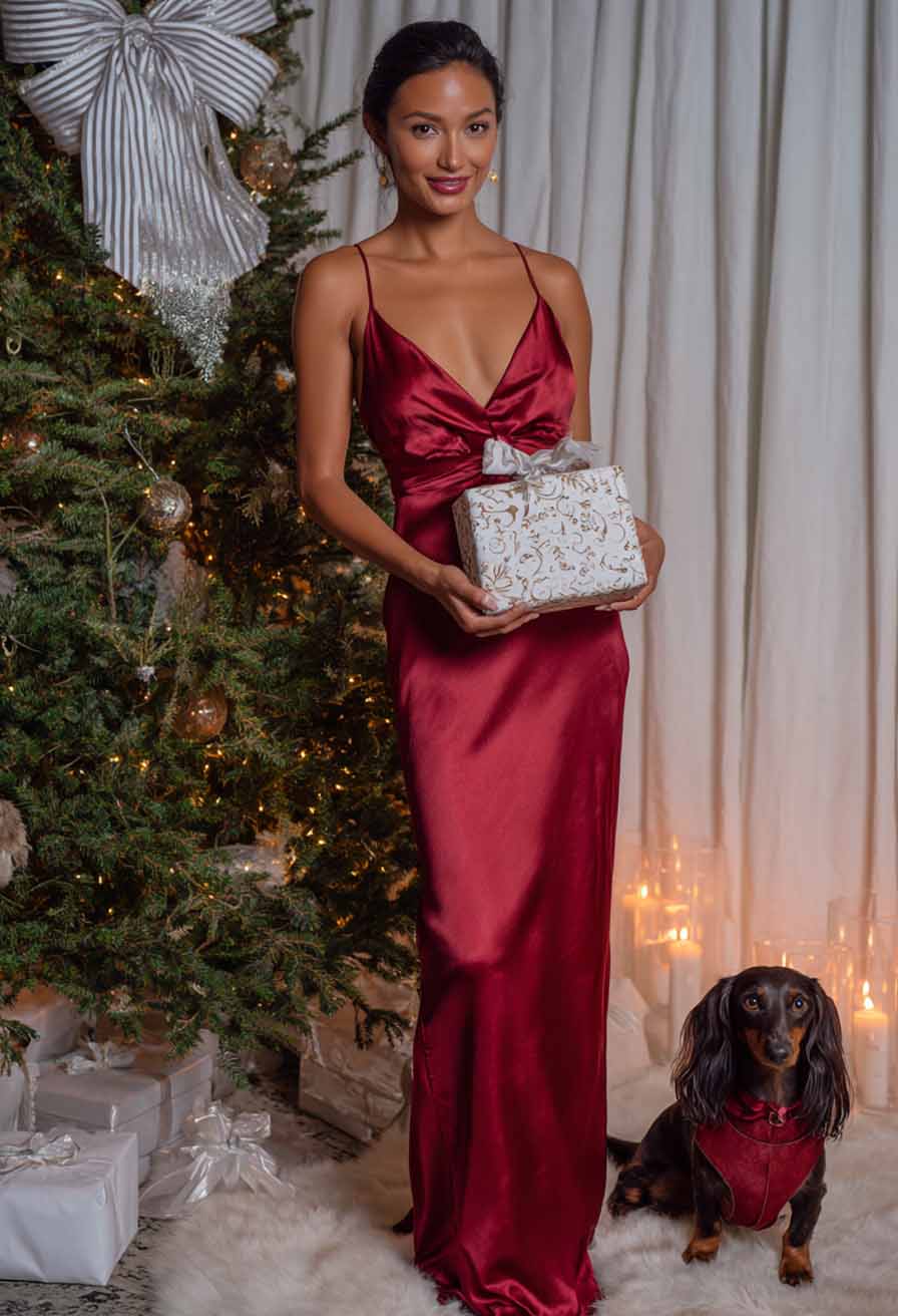 - The Details: The minimalist spaghetti straps and clean, simple cut create a silhouette that feels modern, refined, and luxurious. There’s no lace, no embellishment, no drama. This dress is about just pure, intentional simplicity. The rich red tone adds festive depth, but the overall vibe stays chic, understated, and polished.