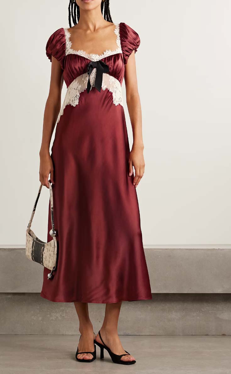 ・Cottagecore Red dress 4: a romantic, lace-trimmed burgundy dress that looks like it stepped straight out of an old storybook or a soft Regency Holiday scene.
