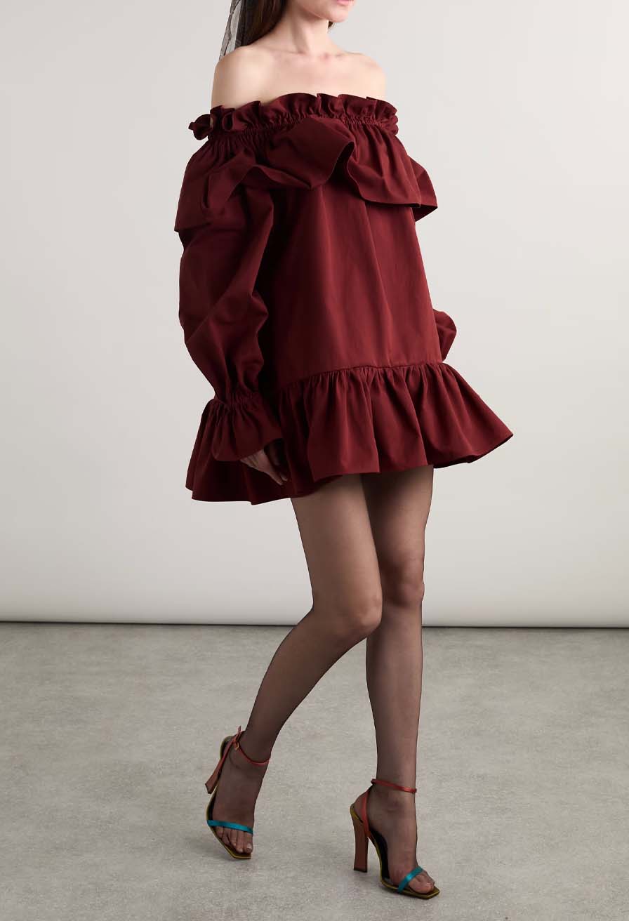 - The Details: The off-the-shoulder ruffled neckline exudes drama and enchantment, while the layered, voluminous sleeves and hem create a magical, spellbinding movement. The deep burgundy color intensifies the mood, infusing the dress with an old-world, candlelit allure that strikes a balance between elegance and a hint of danger in the most beautiful way.