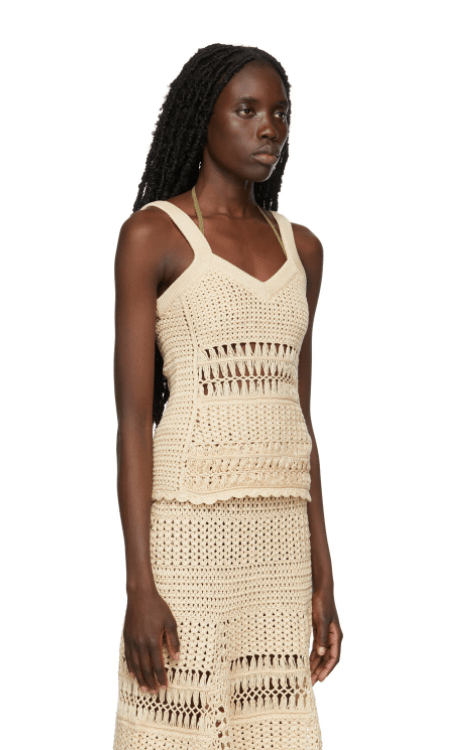 Stella Pardo is famous for her handknit sweaters and this delicate handmade crochet vest follows along the same lines.