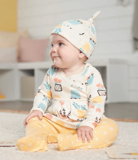 What you’ll find: Bodysuits, dresses, bottoms, tops, knits, pajamas, and sleep gowns – Accessories: mittens, caps, socks, bibs, booties, headwraps – Muslin lovies & Blankets – Bundles & Sets