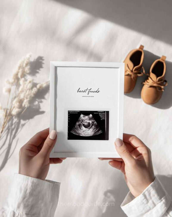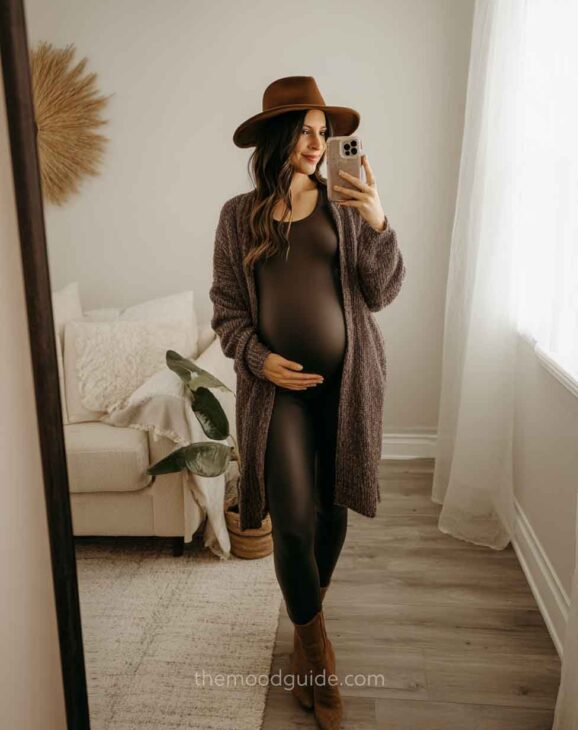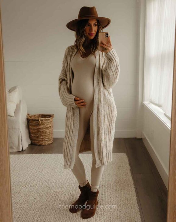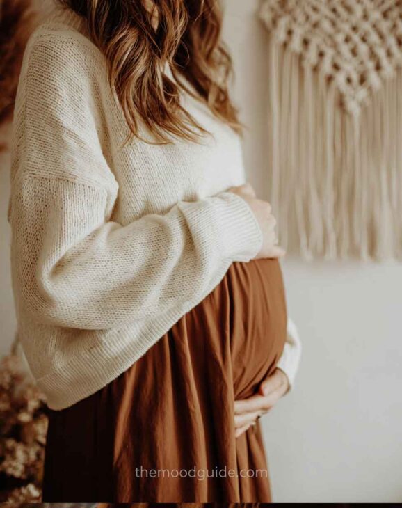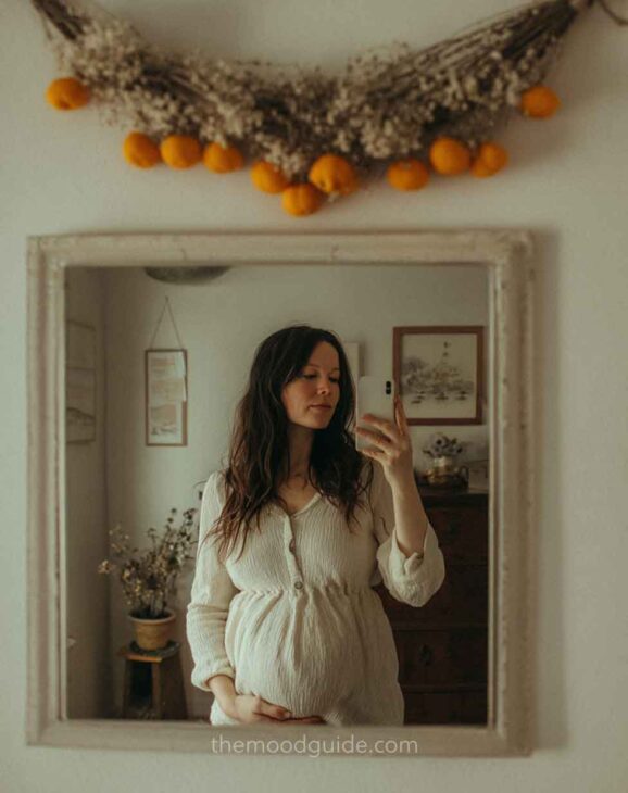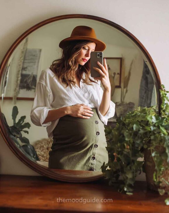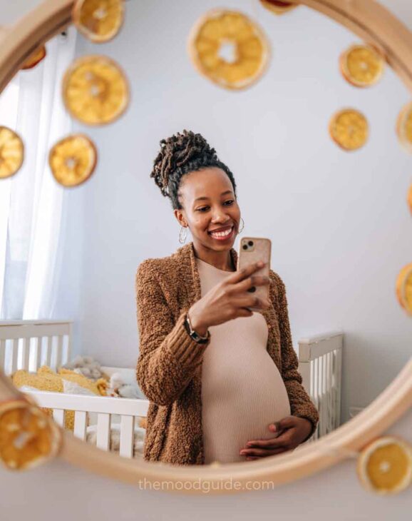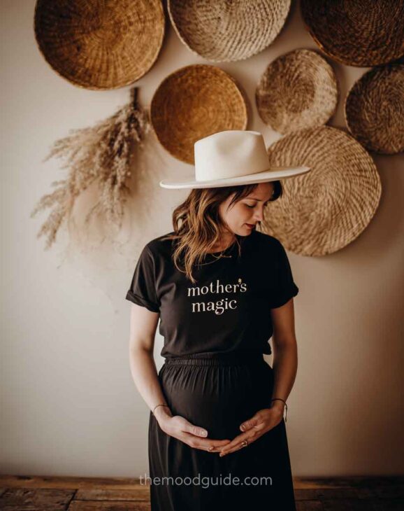 Although this is quite simple, it can also yield stunning natural photos when the composition is done correctly. Natural wood colors, a clean mirror, a boho carpet, and natural decor elements and accessories (such as pillows, chairs, and hats) will create the perfect setting for a beautiful and effortless DIY mirror maternity photo.