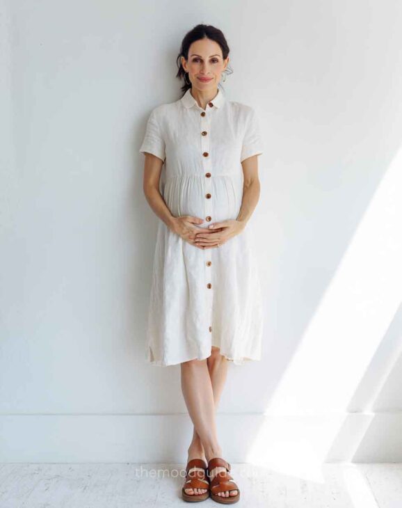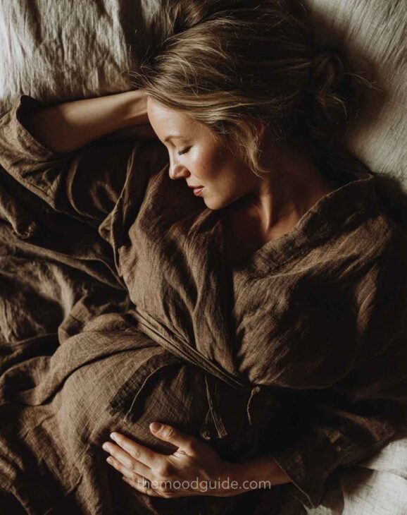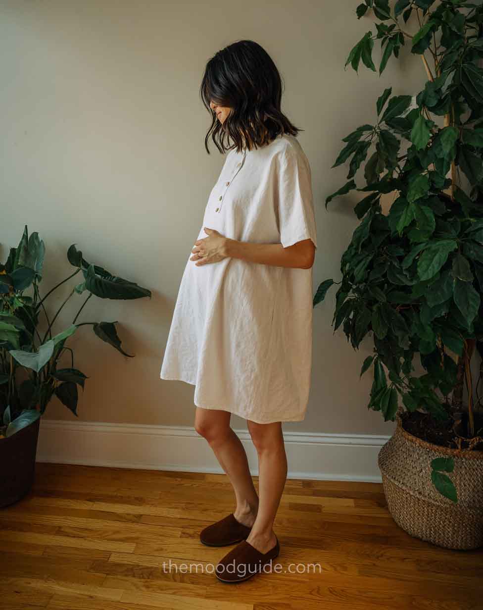 Wear a loose linen or lightweight dress against a clean background and bed setting, and youāre done.