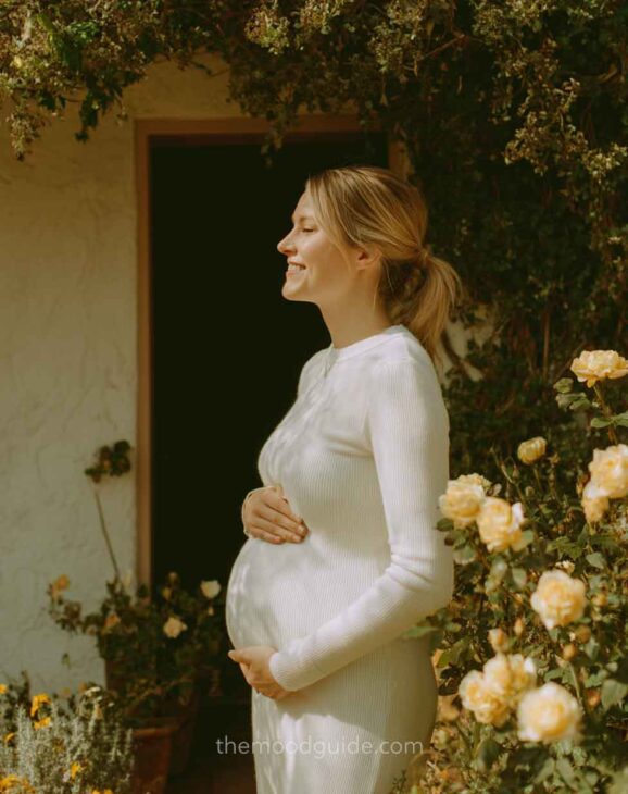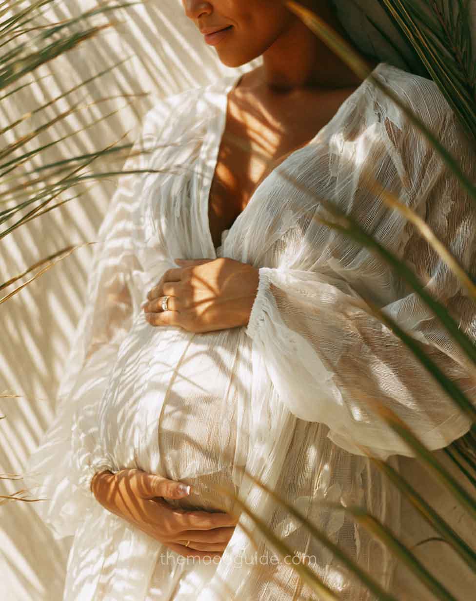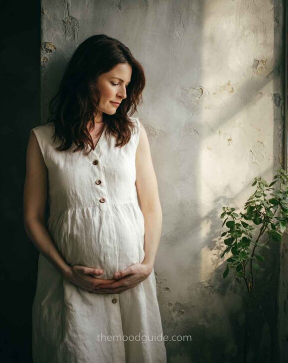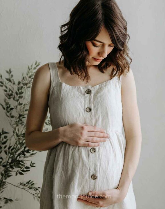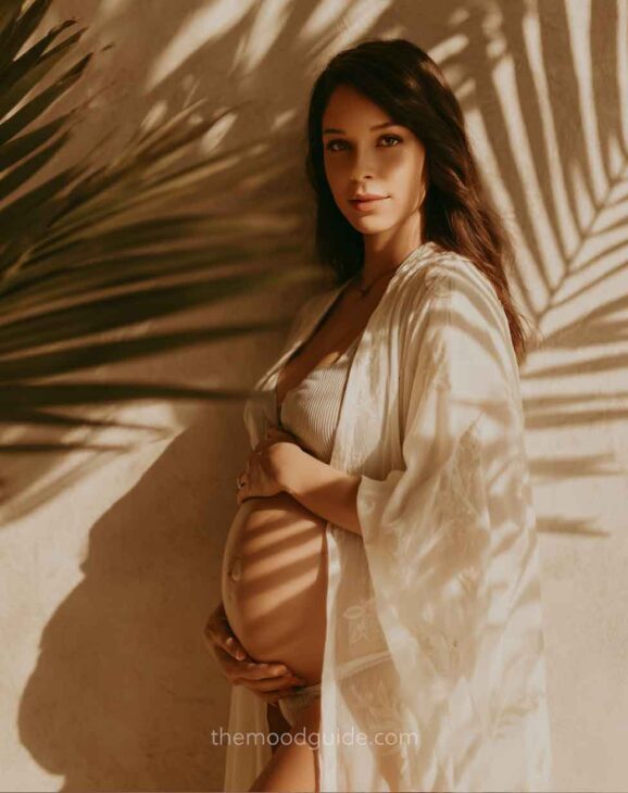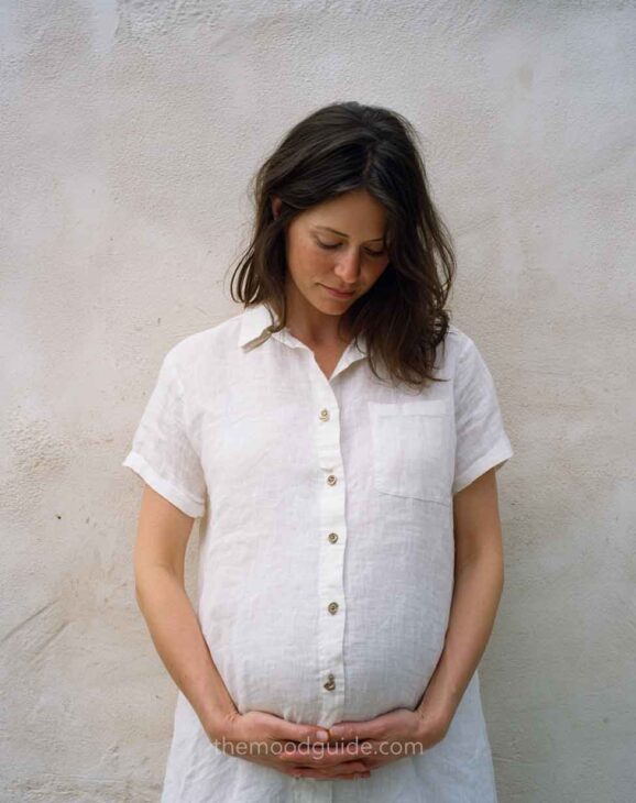 You can choose to cover part of your face or not when taking a profile photo. This angle accentuates the bellyās volume and proportion, drawing attention to the pregnancy rather than the woman. This way, you can focus more or less on your belly! All you need is natural light and a nice linen or cotton outfit.
