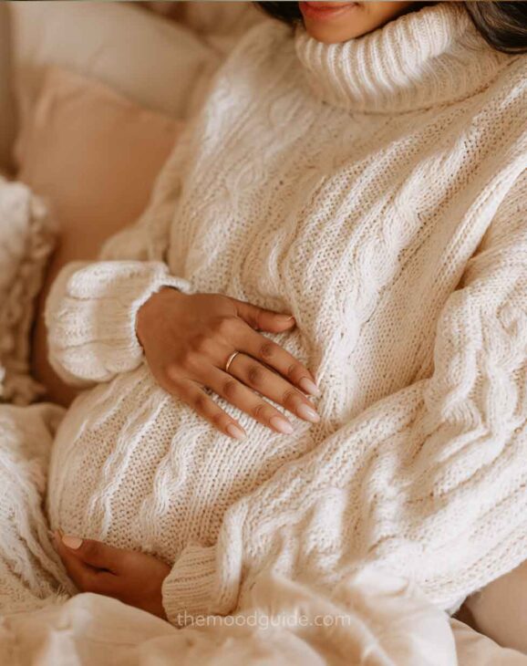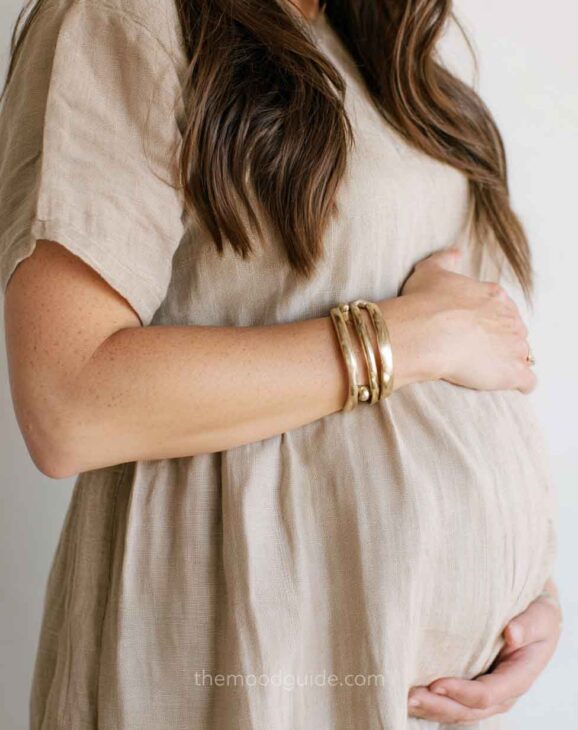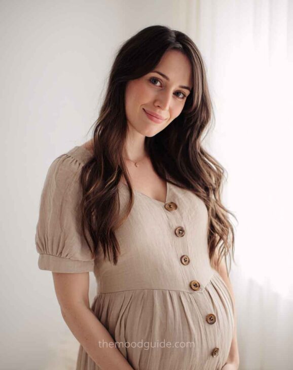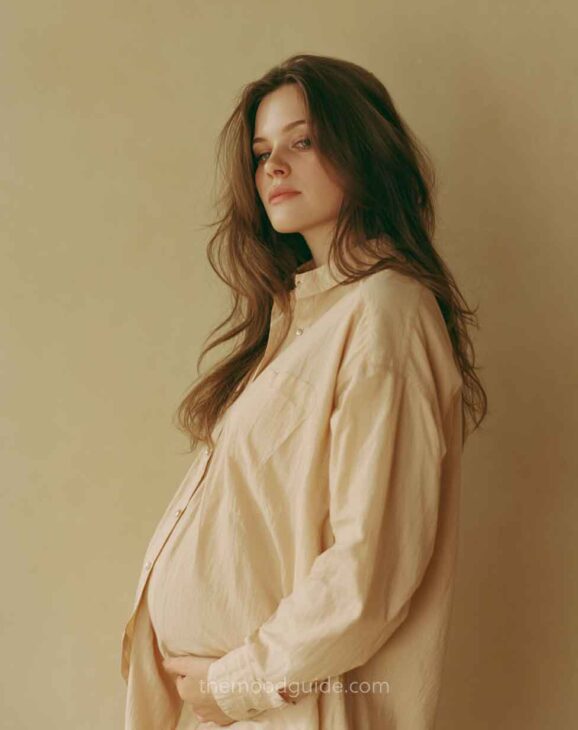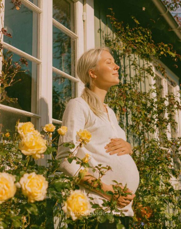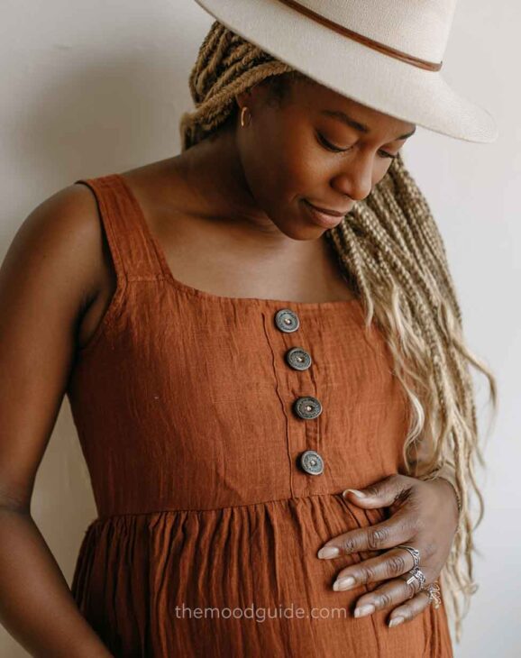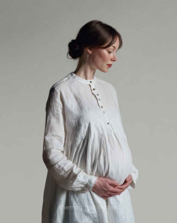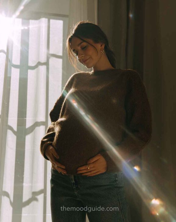 You can choose to cover part of your face or not when taking a profile photo. This angle accentuates the bellyās volume and proportion, drawing attention to the pregnancy rather than the woman. This way, you can focus more or less on your belly! All you need is natural light and a nice linen or cotton outfit.