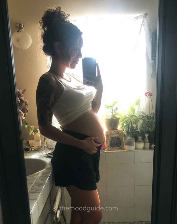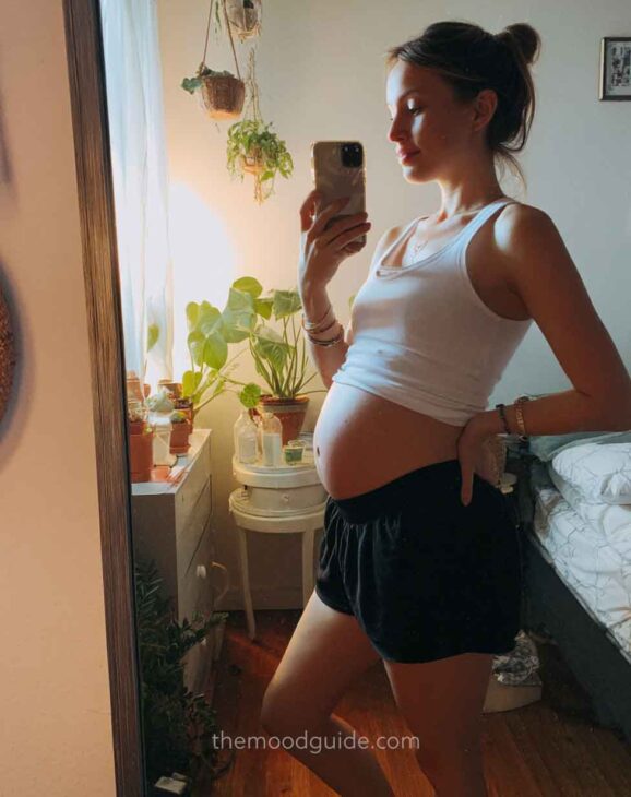 Another easy selfie! Now, focus on the bump: simple, beautiful, and memorable. Earthy and neutral colors, complemented by some bohemian natural bedding, will create the perfect mood!