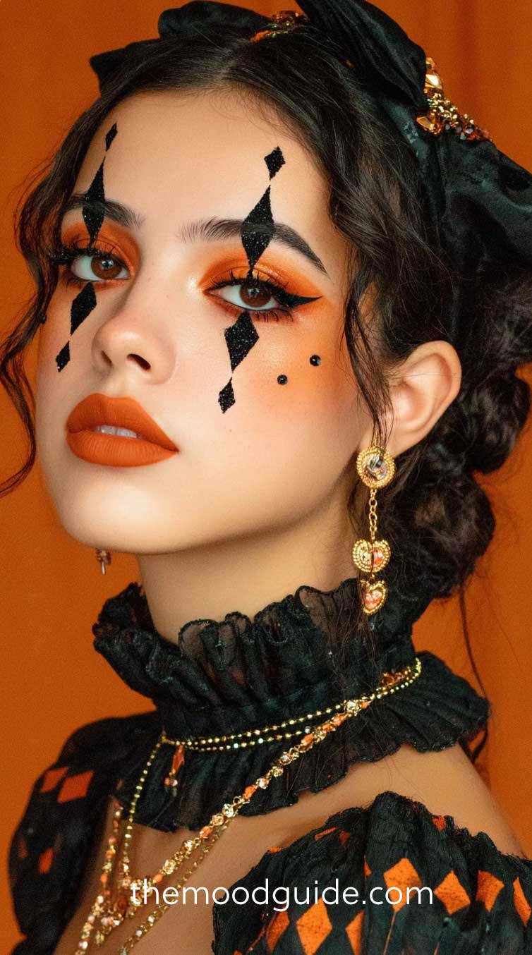 Nothing says Halloween like black and orange. This look uses the classic pumpkin palette combined with bold black accents to create a clown makeup idea that’s festive, easy to recreate, and perfectly in tune with the autumnal spirit.
