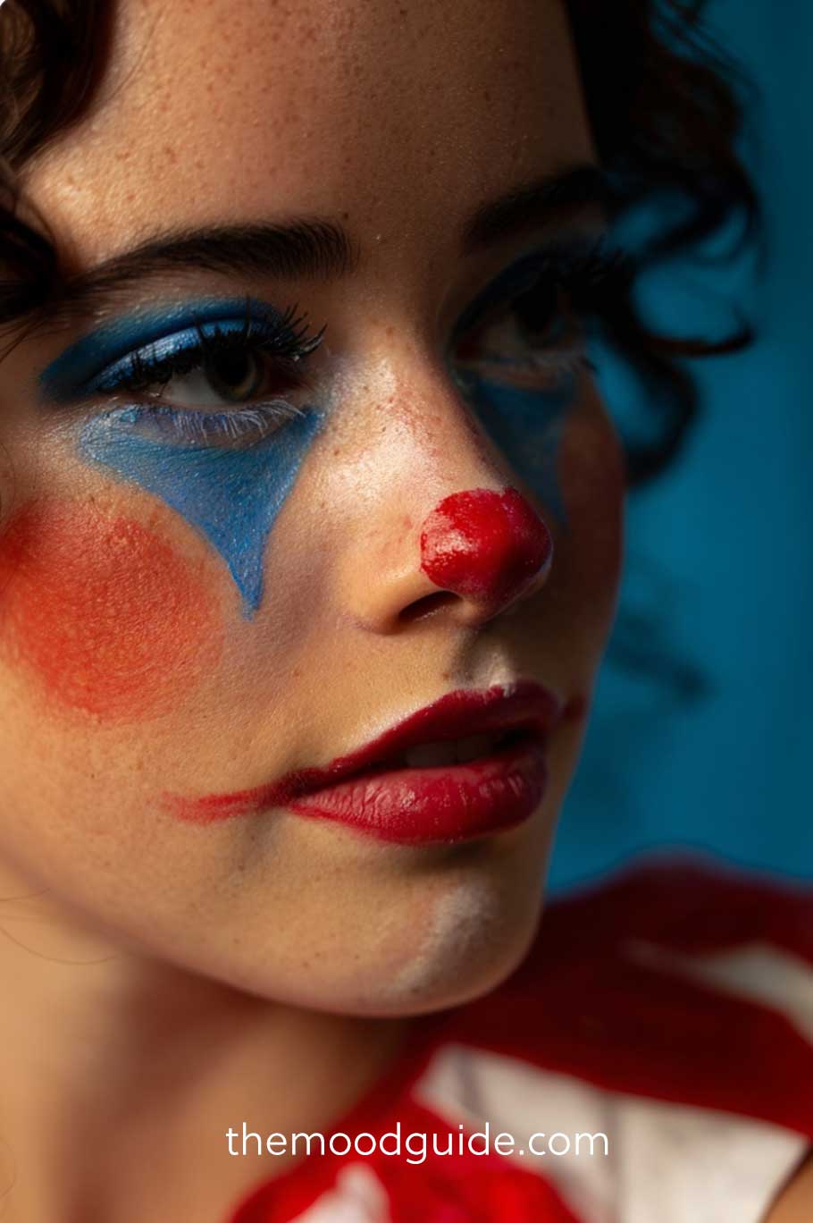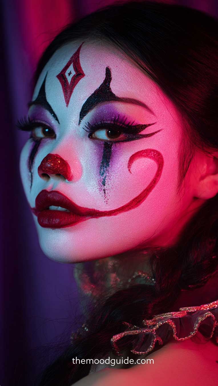 Add a red nose, exaggerated smile, and bold accents around the eyes for a look that’s playful, bright, and unmistakably clownish.