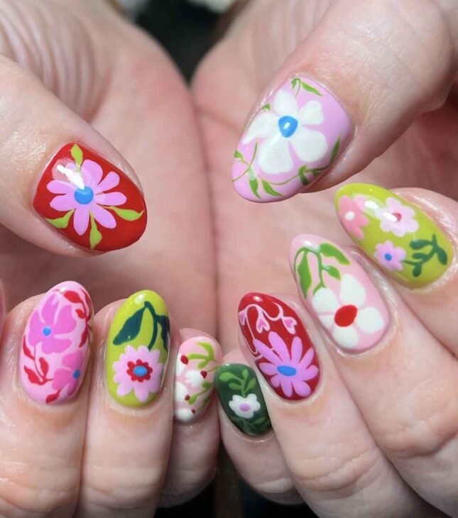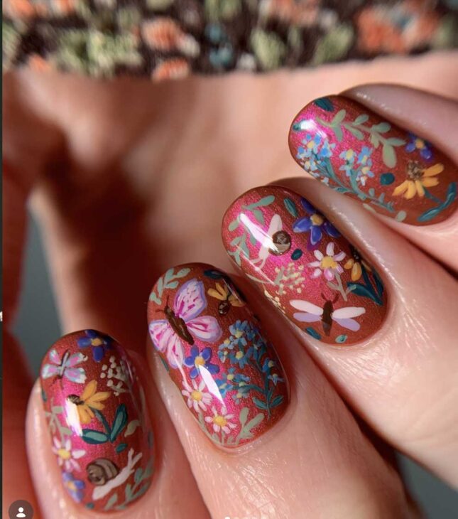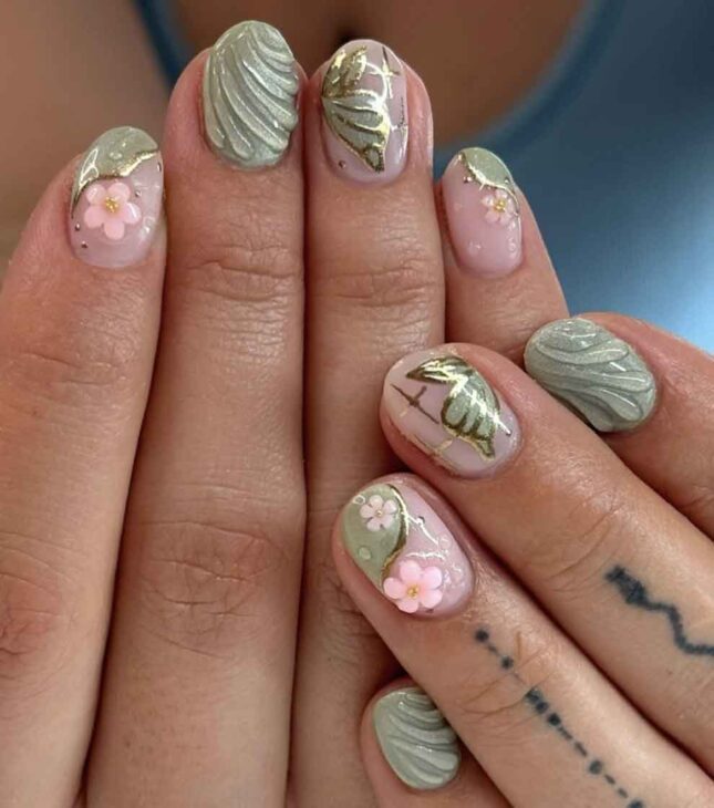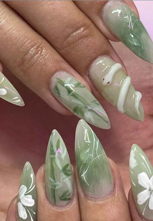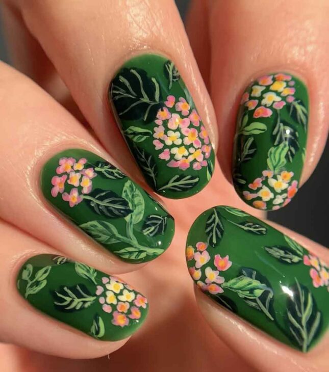 These are nails for spring lovers with a mix of florals and greens and the delicate, whimsical vibes of fairies.