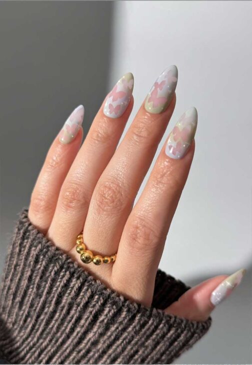 Ultra feminine nails with a soft pastel aesthetic. Add glitter and butterfly designs to evoke the magical dust and fairy wings moods of the fairy core.
