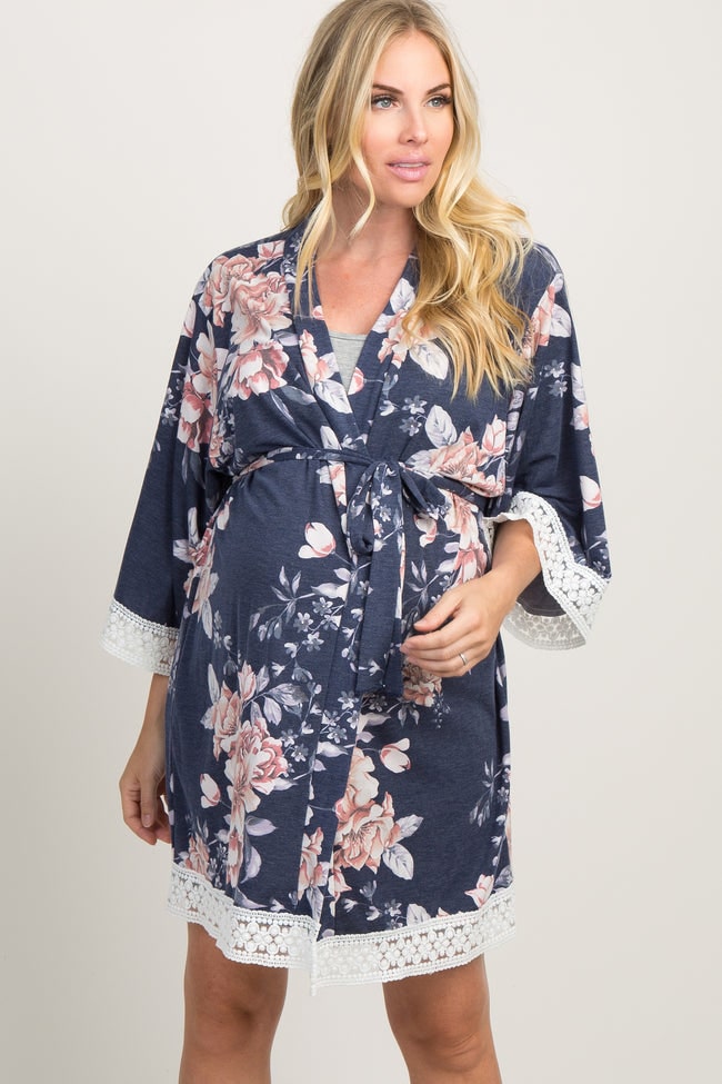 Navy Faded Floral Lace Trim Maternity Delivery/Nursing Robe