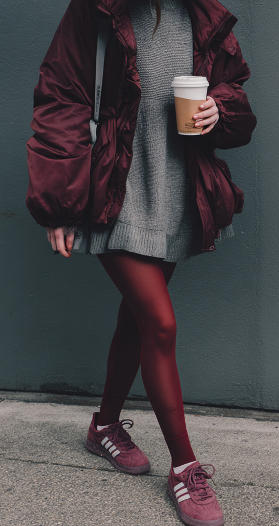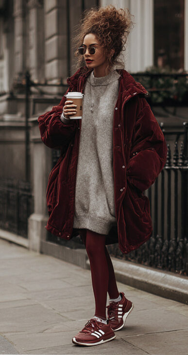 - Burgundi Adidas sneakers paired with a gorgeous oversized coat and a loose grey mini sweater dress.