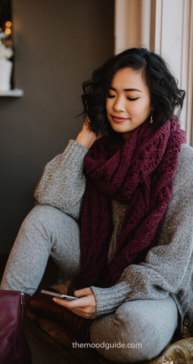 I am obsessed with these results: an ultra cozy and chic winter look with comfy knit all over the outfit. The burgundy here comes as a highlight of luxury in the powerful accessories, like oversized scarfs and ankle boots.