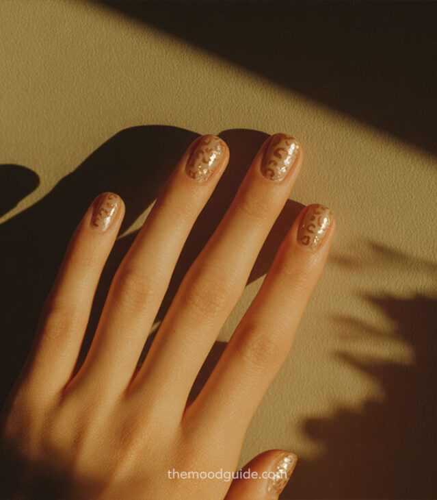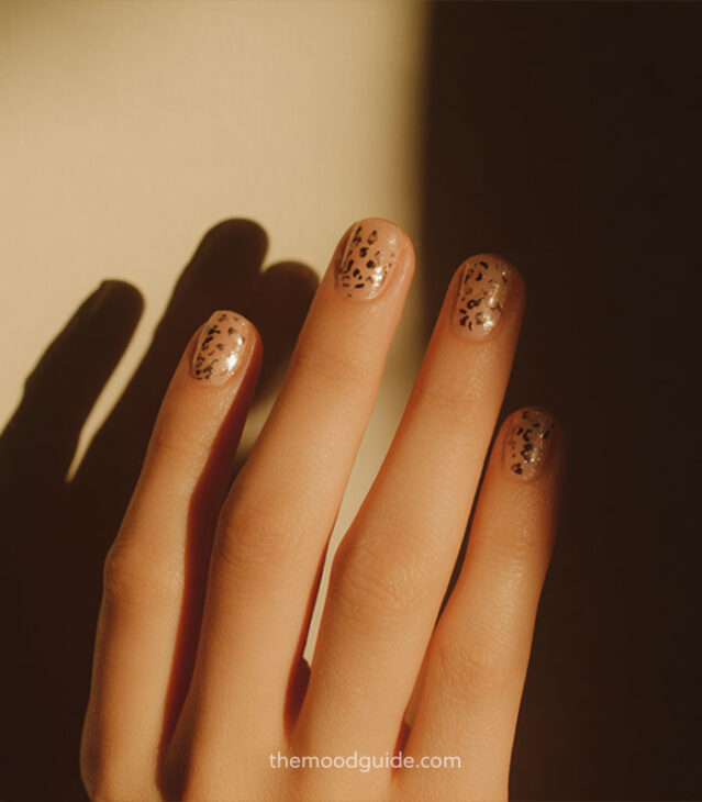 - Same subtle elegance, now with delicate gold leopard prints on the nude base and short nails, creating a very delicate kind of luxury.