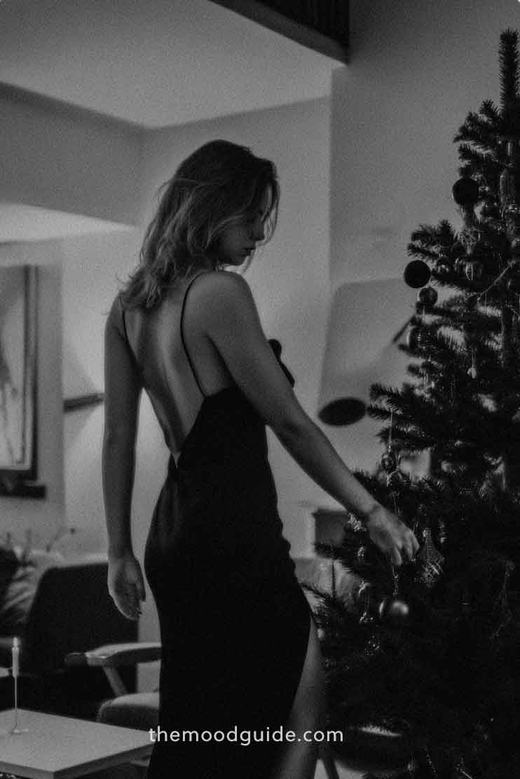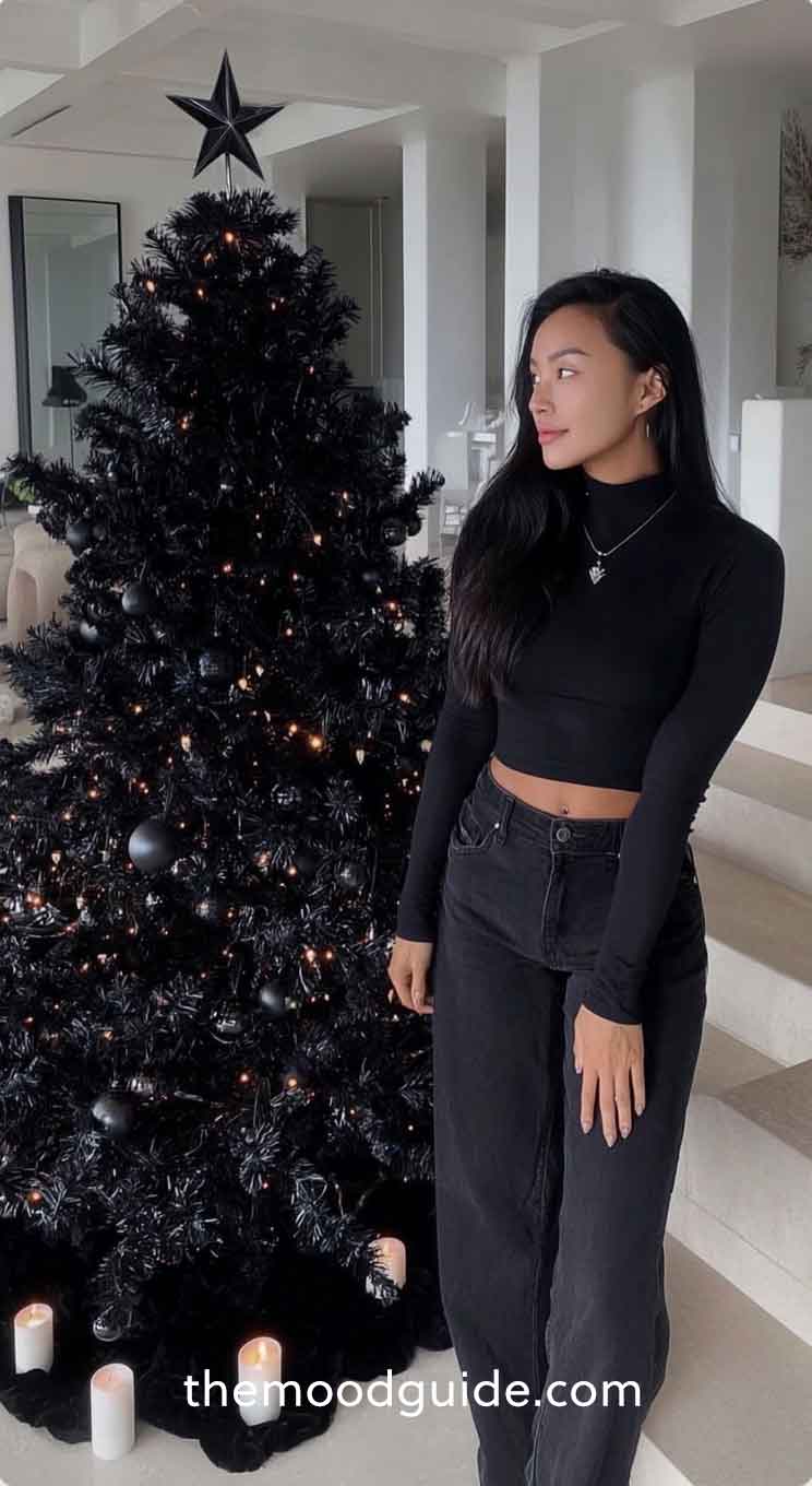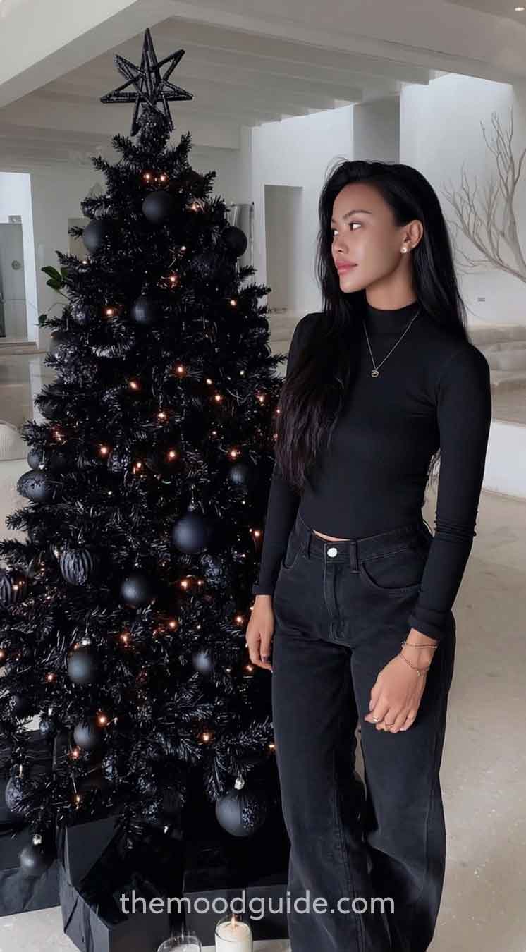 modern luxury christmas trees aesthetic on modern living room with all black dress outfit.