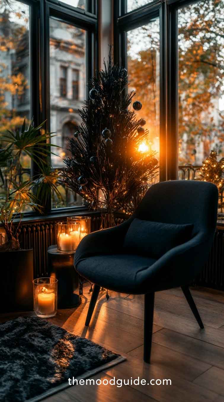 Modern Mystery Meets Holiday Glow when you mix the soft shimmer of warm white fairy lights reflecting off matte and glossy black ornaments. The effect feels cinematic, creating a quiet luxury moment for the Holiday.