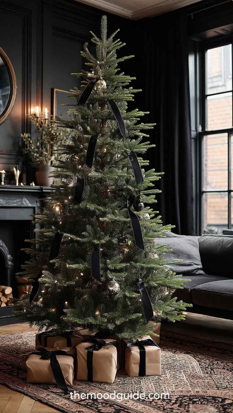 Black vertical ribbons also work beautifully for this simple and modern Christmas tree effect.