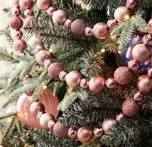 If you want to go all in on the look, a blush or soft pink pre-lit tree is the perfect base. You can also start with a white tree and decorate it entirely in pink hues for a luminous pastel effect.