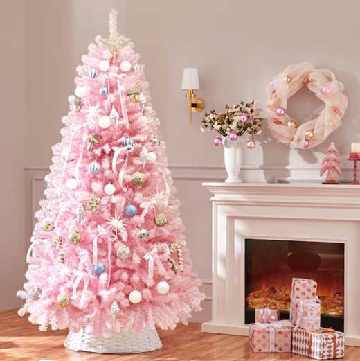 When you add white to a pink Christmas tree, you instantly evoke a whimsical, snowy, winter wonderland mood. Whether it’s a flocked pink tree dusted in soft white snow or a pure white tree sparkling with pink ornaments, the result is a dreamy, enchanted forest that feels like it belongs in a fairytale.