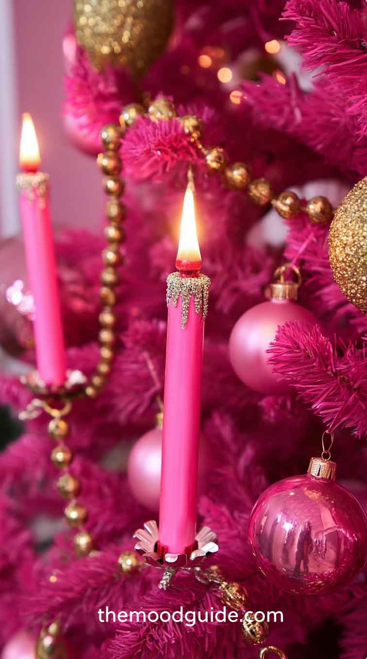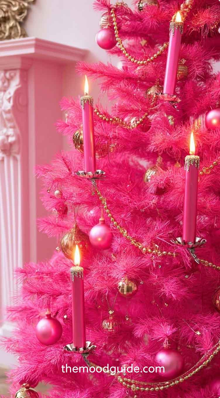 Choose bold shades of pink — hot pink, fuchsia, and magenta — and mix them with silver, white, or holographic ornaments for dimension. Add disco balls, sequined baubles, heart-shaped ornaments, and oversized bows.
