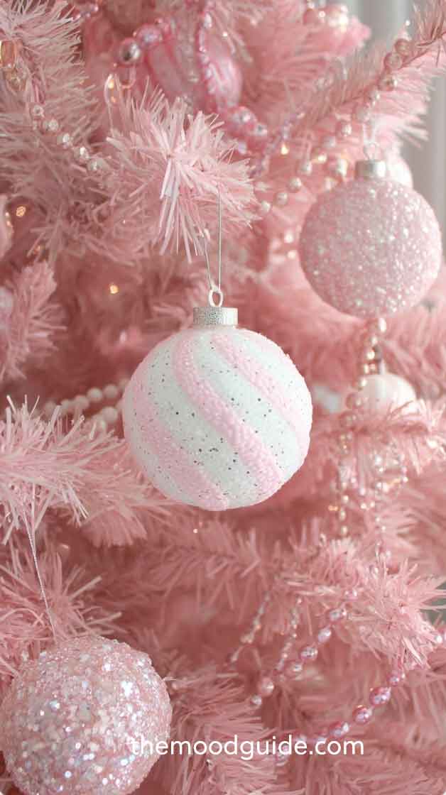 To recreate this look, combine blush, baby pink, and pearly white ornaments. Mix in silver glittery pieces for a frosty touch to add that winter sparkle. For soft and innocent vibes, combine fuzzy sugar plum ornaments in soft shades of pink and white.