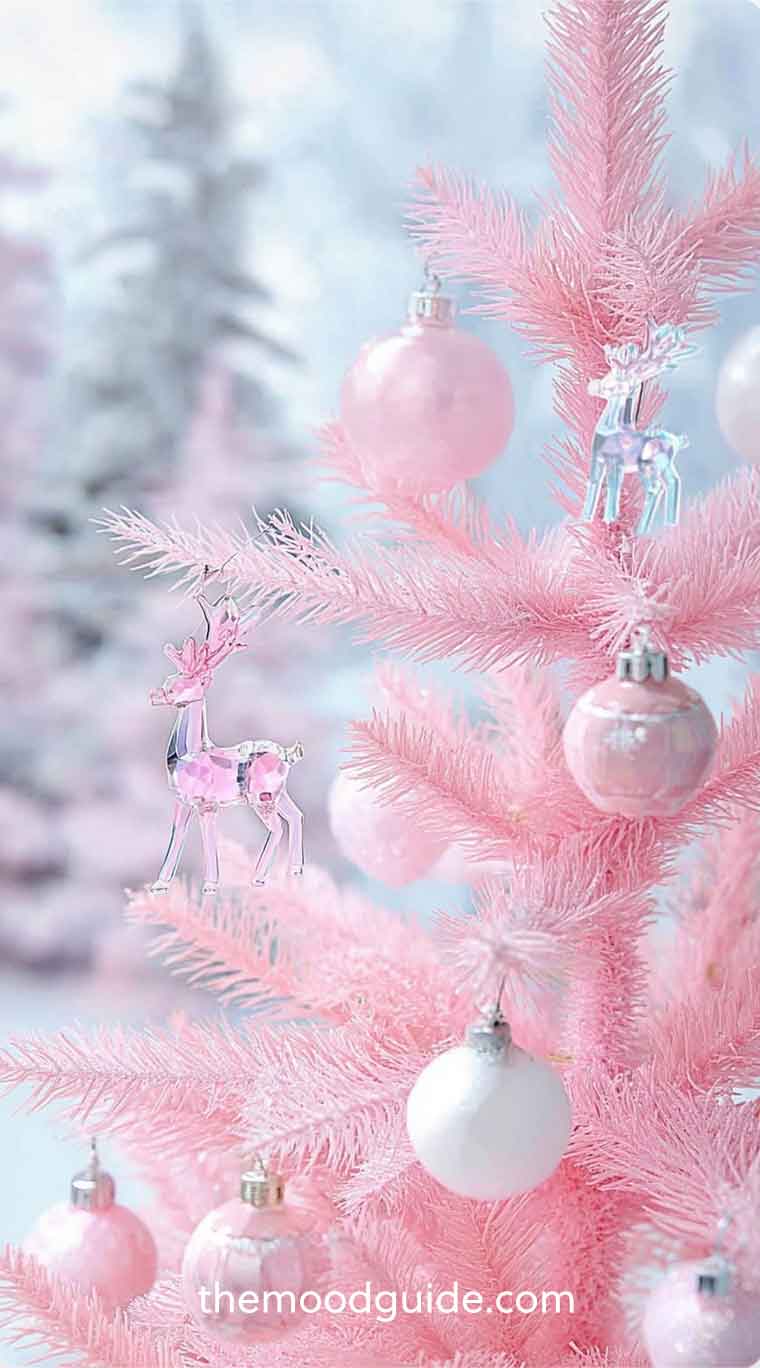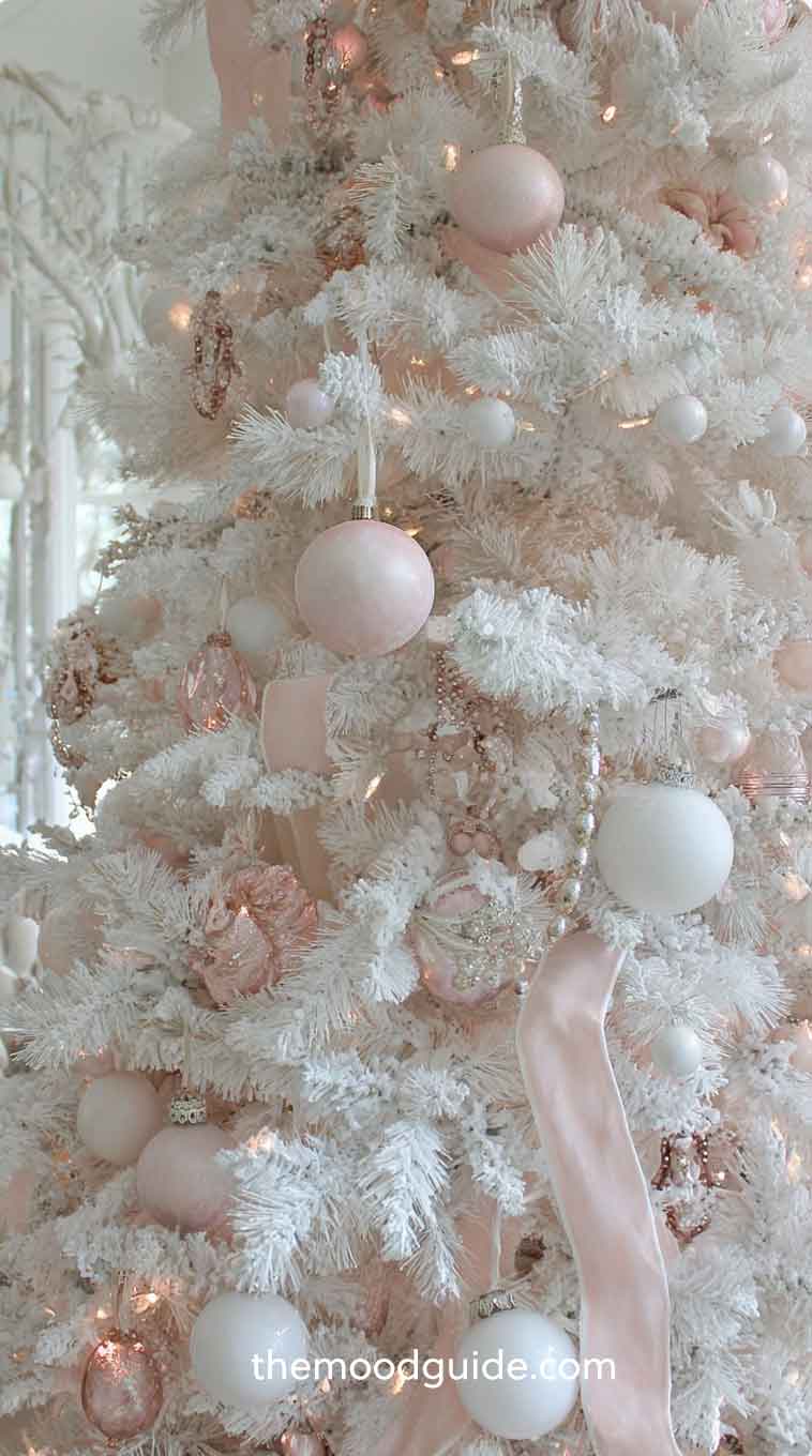 Flocked pink or white trees work beautifully for this theme. For an extra ethereal effect, choose a pre-lit white tree with warm white or blush-toned lights — the glow will make your ornaments look like they’re floating in snow.