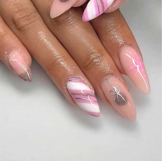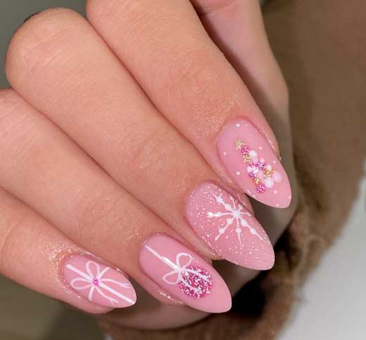 Square and coffin nails also look beautiful with delicate pink and white Christmas designs accented by glittery details.