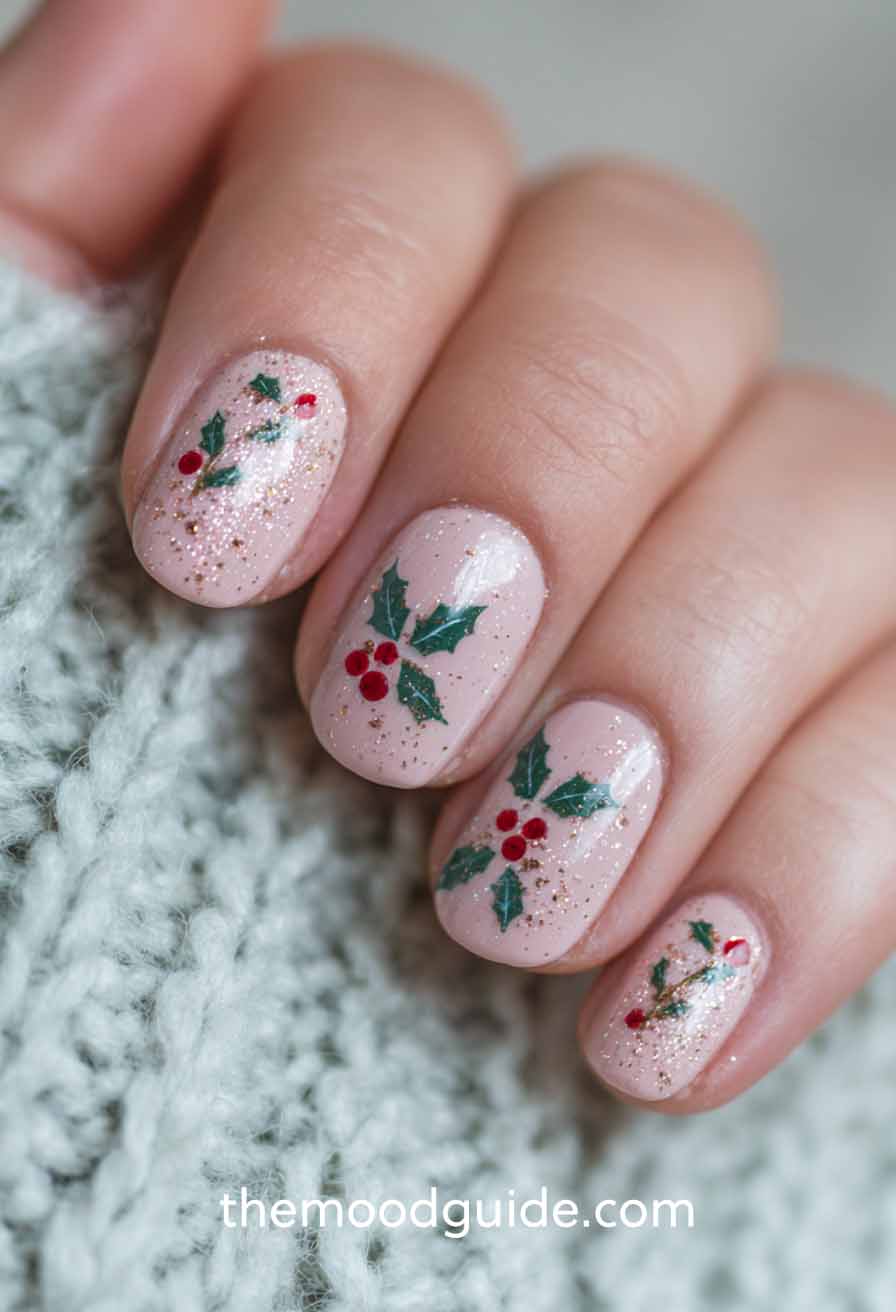- Soft pink nails adorned with delicate holly berries and a touch of glittery gold to capture the festive spirit.