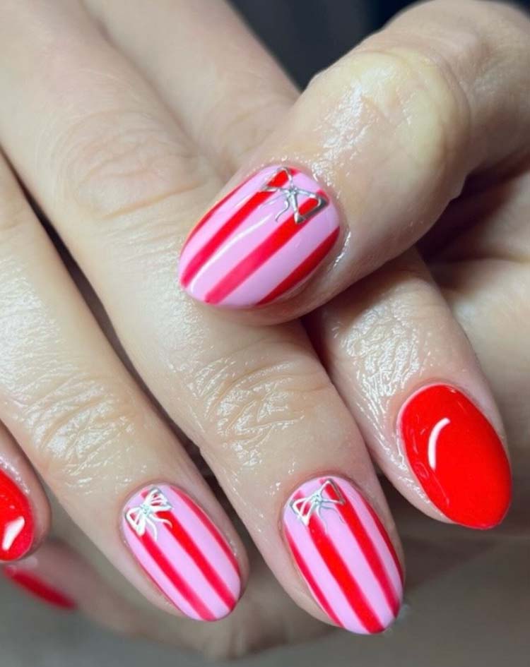 The second most popular design featuring this color combo on Instagram is a holiday-coquette look, perfect for nail art wrapped as gifts, adorned with beautiful bow designs.
