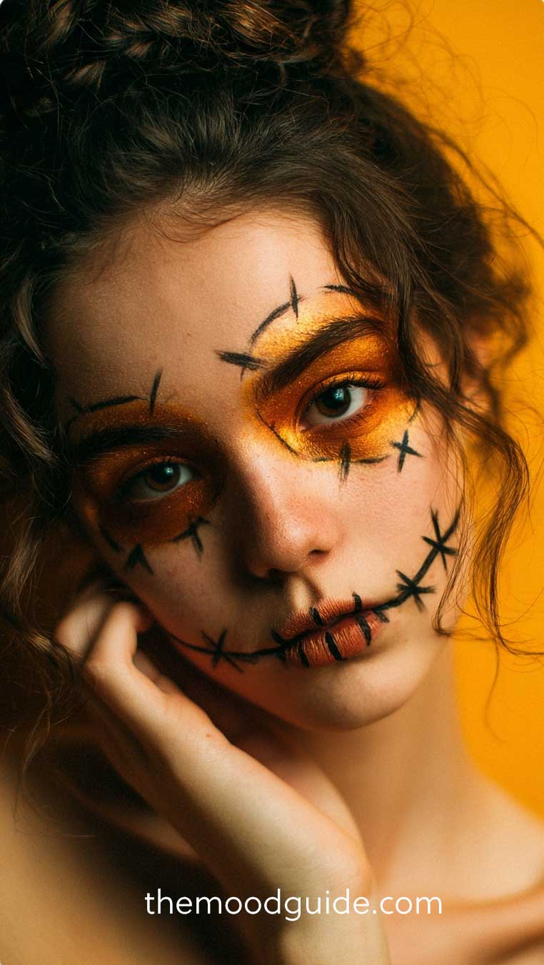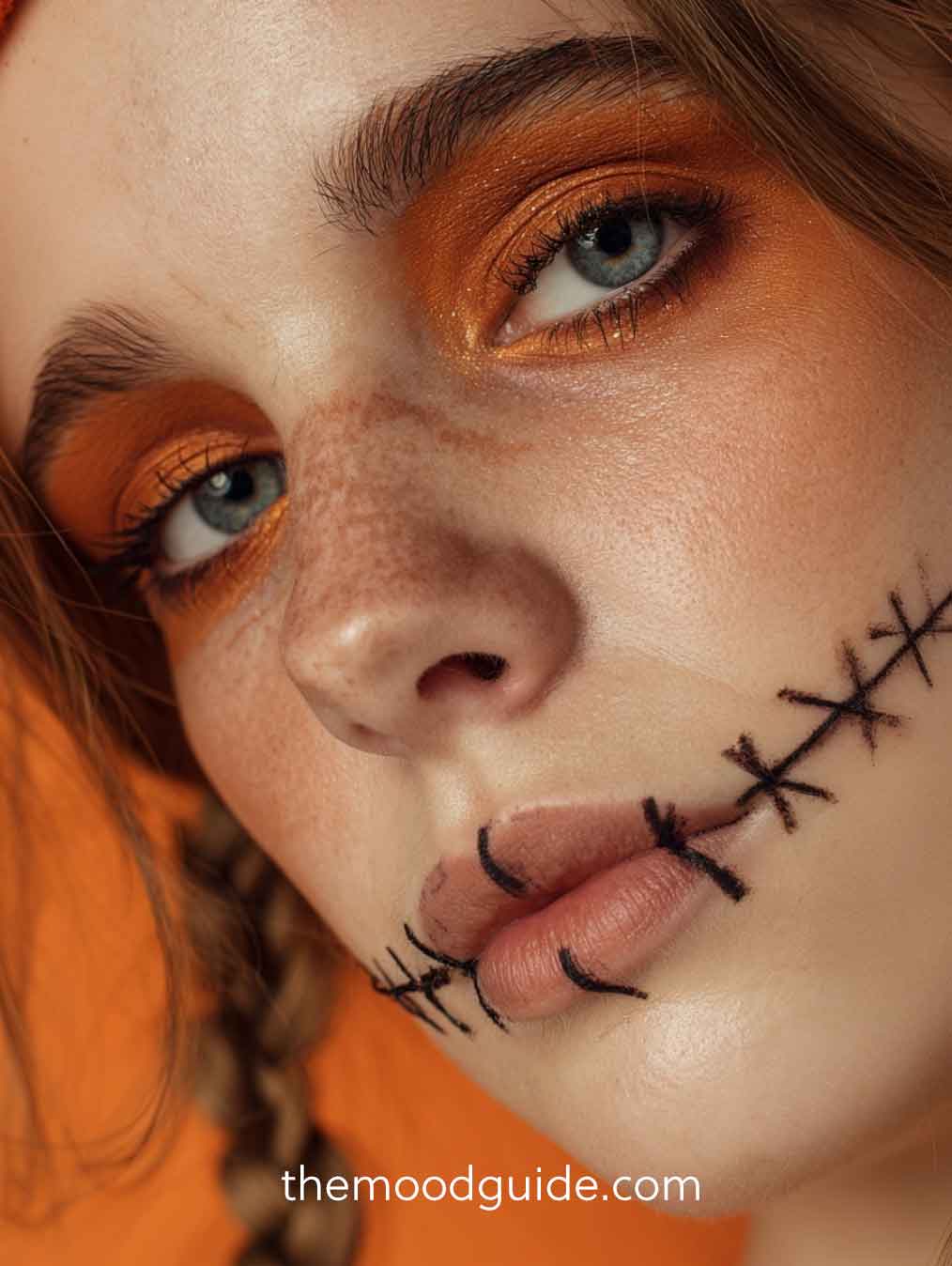 12- Basic scarecrow makeup, where all it takes is orange eyeshadows and simple hand-drawn stitches.