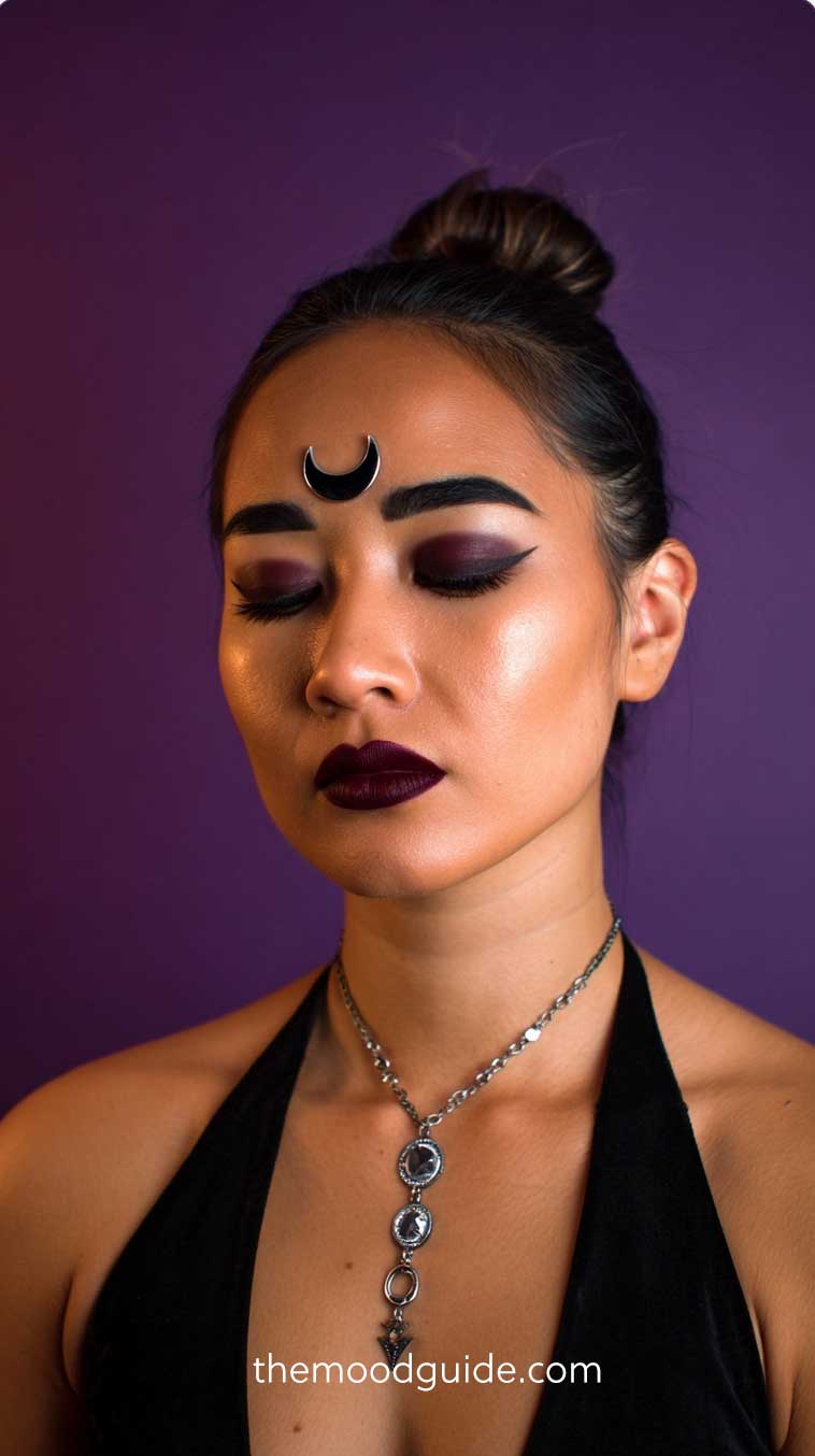 20- Another moody option just to get in the Halloween vibe for work or school with almost zero effort, this matte purple lips and eyeliner makes a perfect cute and easy pastel goth makeup.