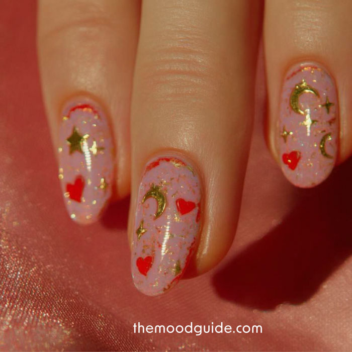 26- Nude base and cute gold celestial stickers and little red hearts stickers is all you need.